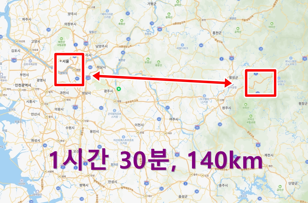 소요시간은 약 1시간 30분, 거리는 140km 입니다
